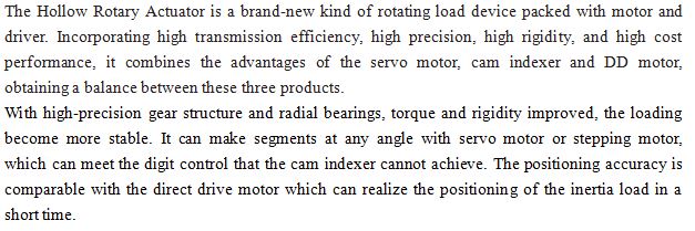 中空回転プラットフォームは、出力トルクを増加させるために単段ヘリカルギア減速を採用しています。 ギア精度グレードは5グレード未満です。 加えて、フレキシブルギャップ調整機構は、2つのギアの中心距離を変えることによってバックラッシュを制御し、中空回転プラットフォームを空にする。 戻りは非常に小さく、繰り返し位置決め精度は5秒未満です。